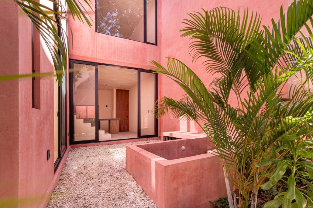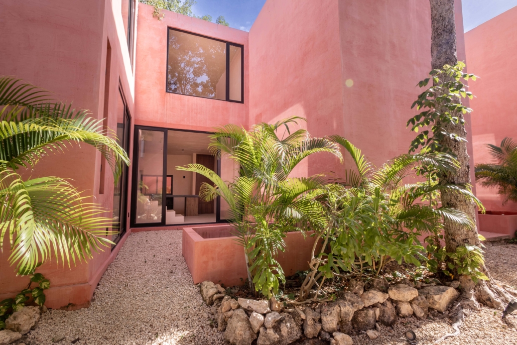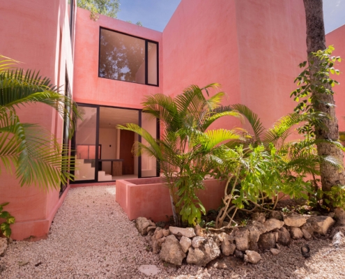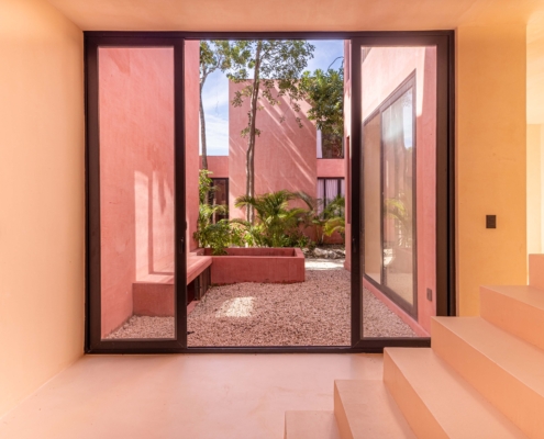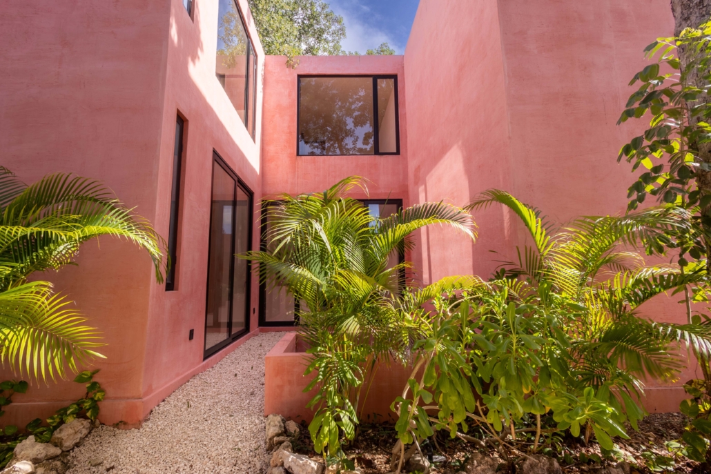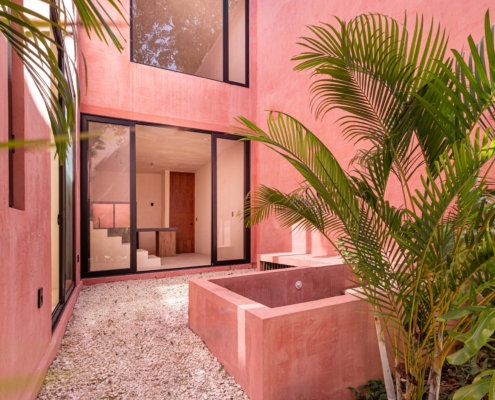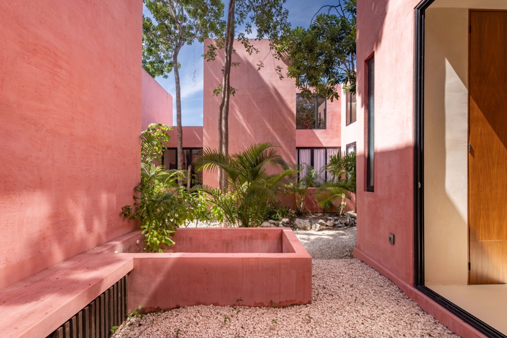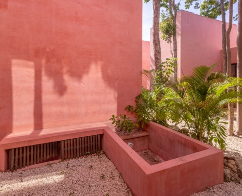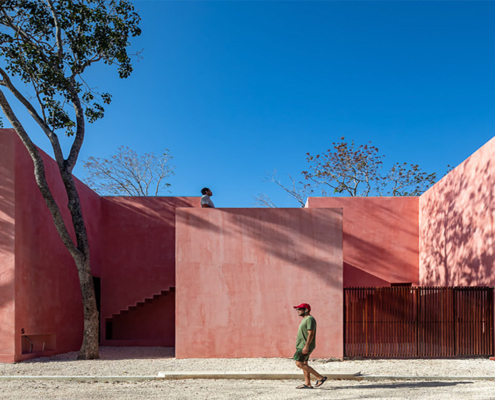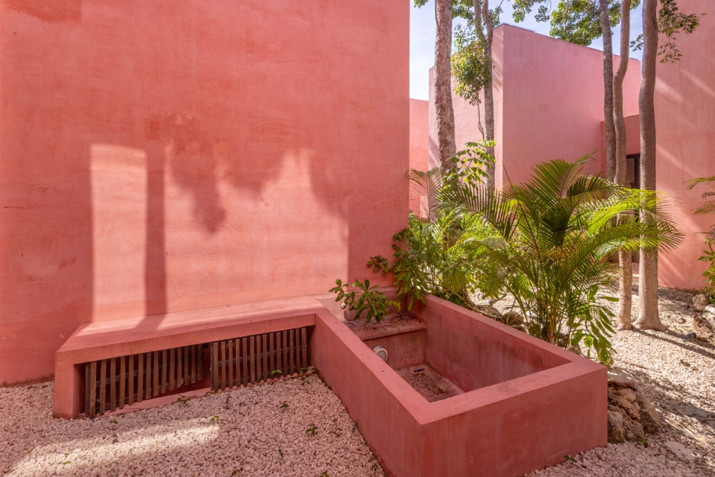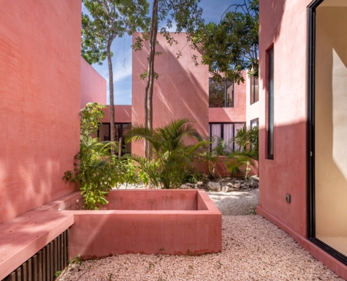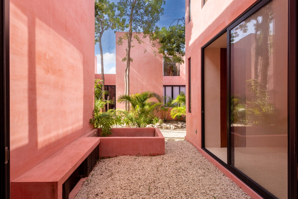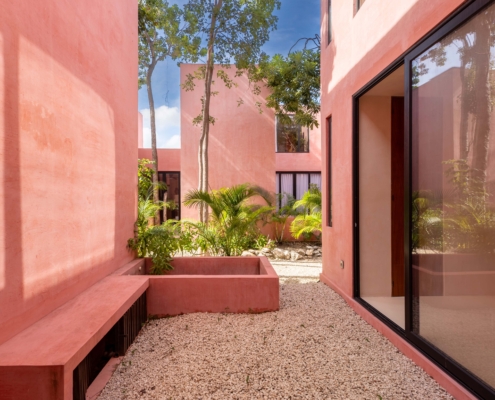The playful configuration of intertwined volumes in reddish tones poses a pattern of hollows and solids between shadows in the Mexican city of Tulum, in the Yucatan Peninsula. Separated by an elongated garden of native plants, the arrangement of 39 dwellings in two parallel rows allows for cross ventilation and natural lighting of the spaces. Between sheets of water, the sculptural composition is defined by a coating of local tradition, the chukum, a mixture of the resin of the tree of the same name with cement and limestone, which gives the project an identity of its own. The complex has a permeable and vegetated floor in the common areas and parking lots, facilitating sustainable water management and environmental balance.