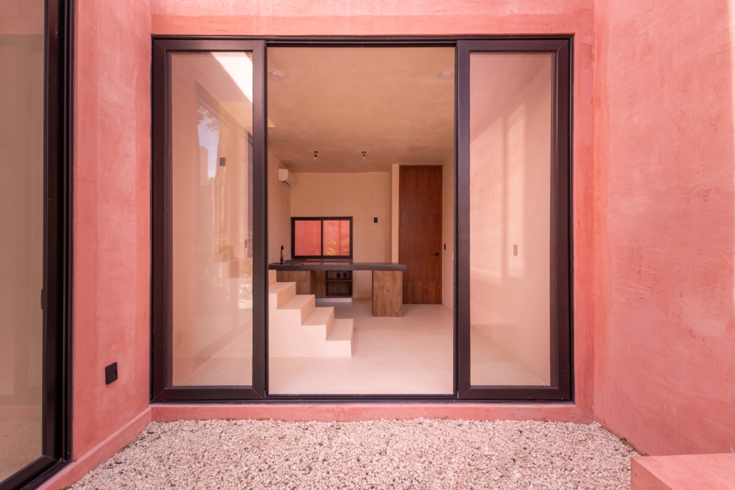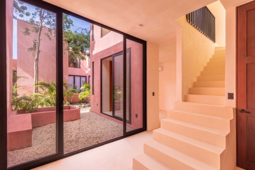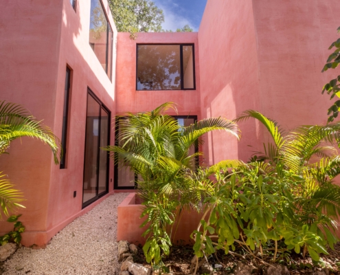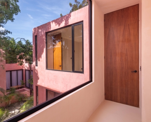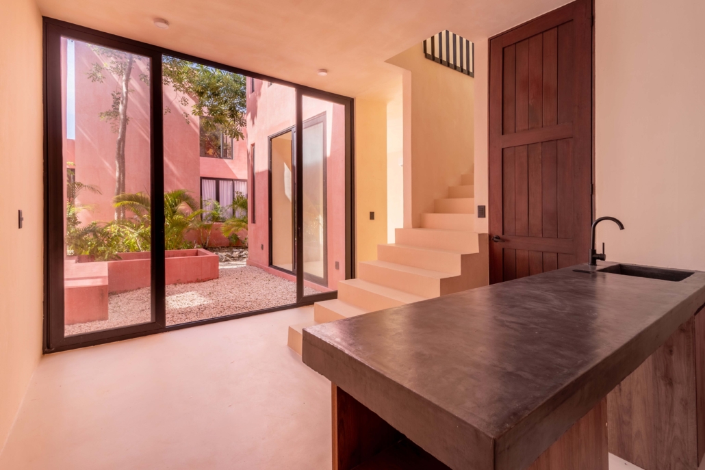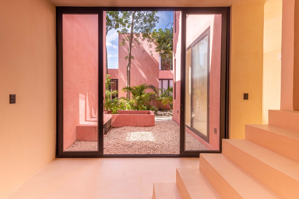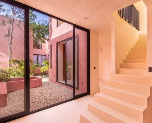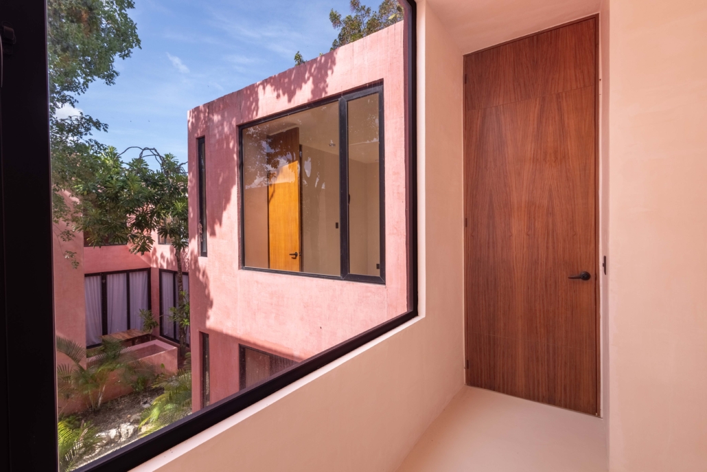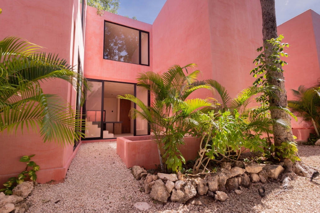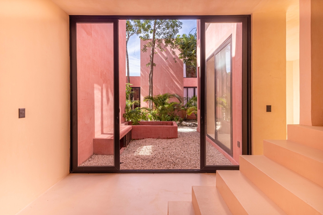 The playful configuration of intertwined volumes in reddish tones poses a pattern of hollows and solids between shadows in the Mexican city of Tulum, in the Yucatan Peninsula. Separated by an elongated garden of native plants, the arrangement of 39 dwellings in two parallel rows allows for cross ventilation and natural lighting of the spaces. Between sheets of water, the sculptural composition is defined by a coating of local tradition, the chukum, a mixture of the resin of the tree of the same name with cement and limestone, which gives the project an identity of its own. The complex has a permeable and vegetated floor in the common areas and parking lots, facilitating sustainable water management and environmental balance.