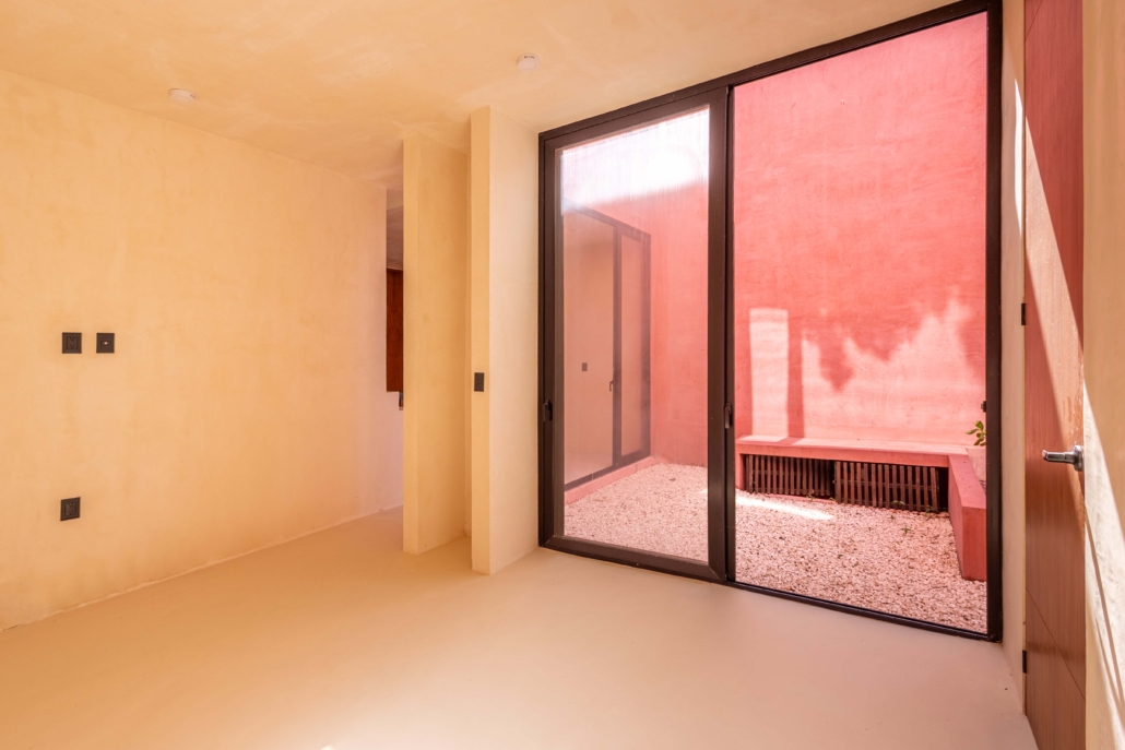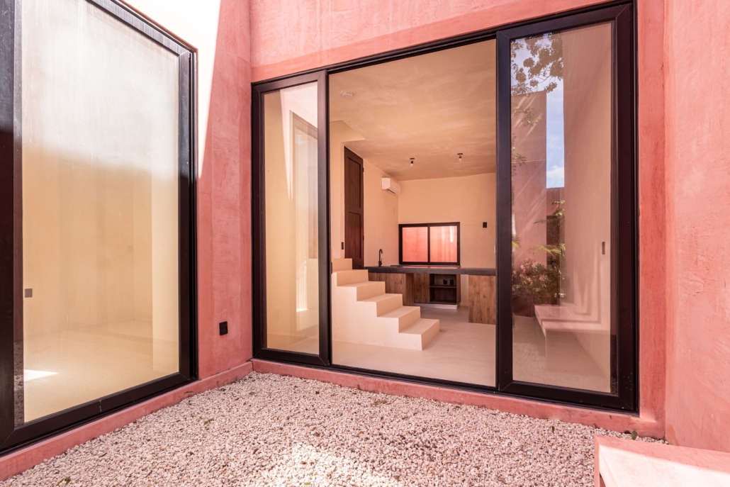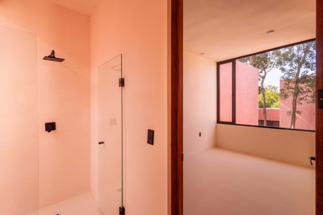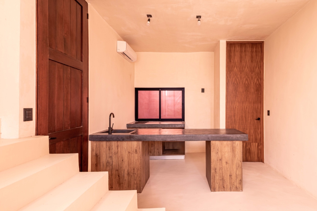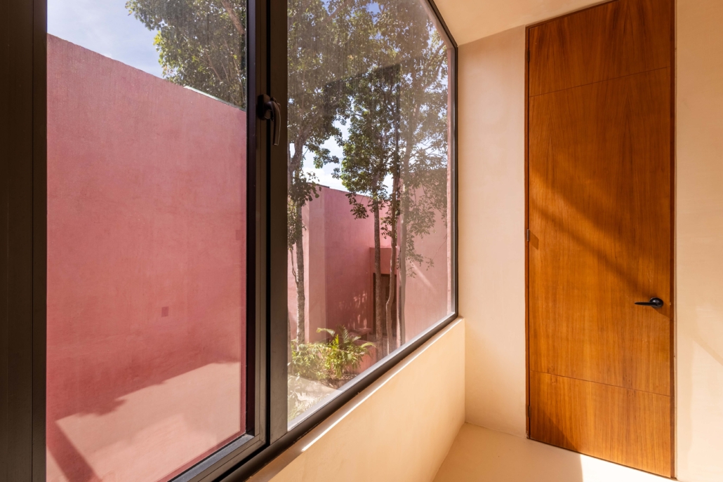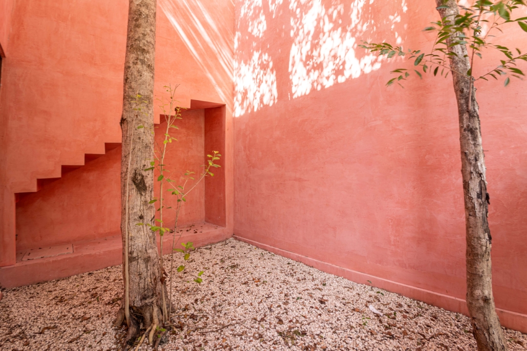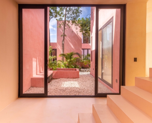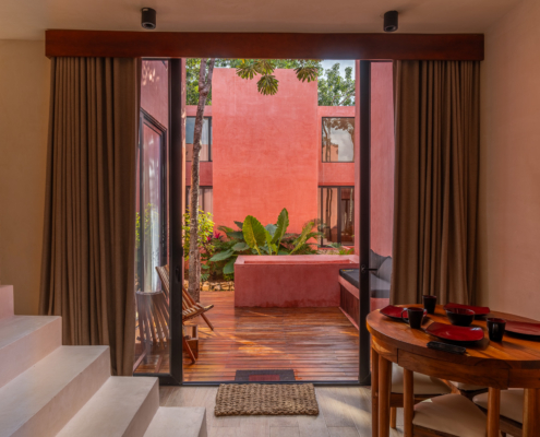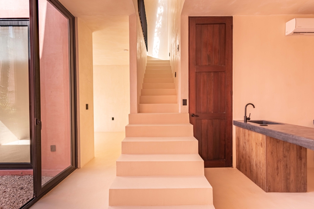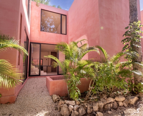 The playful configuration of intertwined volumes in reddish tones poses a pattern of hollows and solids between shadows in the Mexican city of Tulum, in the Yucatan Peninsula. Separated by an elongated garden of native plants, the arrangement of 39 dwellings in two parallel rows allows for cross ventilation and natural lighting of the spaces. Between sheets of water, the sculptural composition is defined by a coating of local tradition, the chukum, a mixture of the resin of the tree of the same name with cement and limestone, which gives the project an identity of its own. The complex has a permeable and vegetated floor in the common areas and parking lots, facilitating sustainable water management and environmental balance.