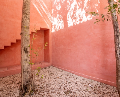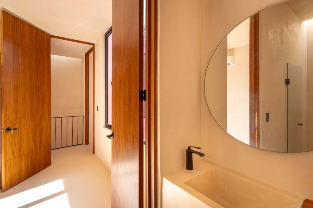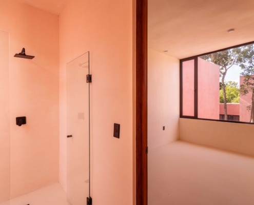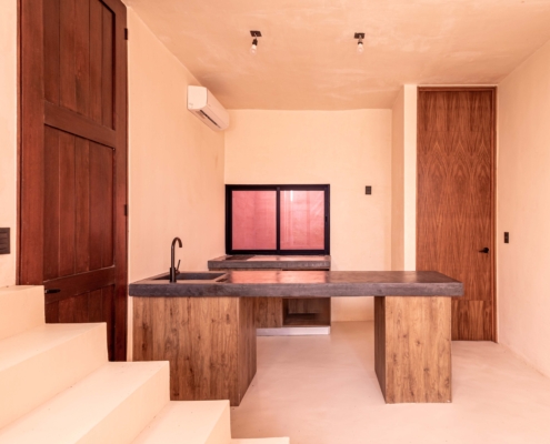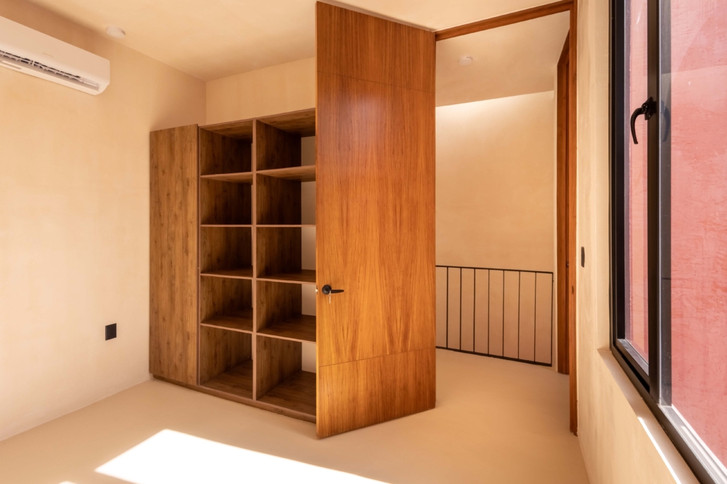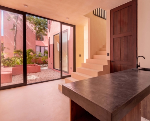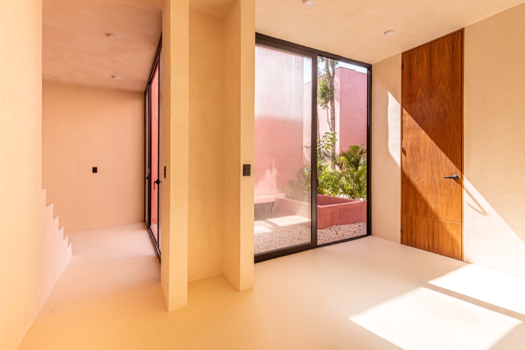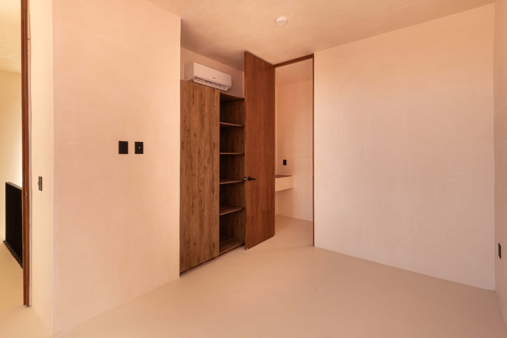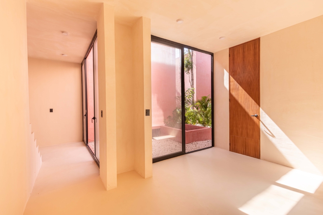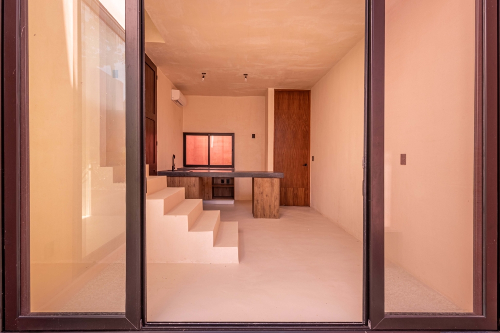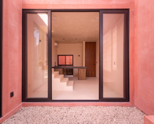 The playful configuration of intertwined volumes in reddish tones poses a pattern of hollows and solids between shadows in the Mexican city of Tulum, in the Yucatan Peninsula. Separated by an elongated garden of native plants, the arrangement of 39 dwellings in two parallel rows allows for cross ventilation and natural lighting of the spaces. Between sheets of water, the sculptural composition is defined by a coating of local tradition, the chukum, a mixture of the resin of the tree of the same name with cement and limestone, which gives the project an identity of its own. The complex has a permeable and vegetated floor in the common areas and parking lots, facilitating sustainable water management and environmental balance.