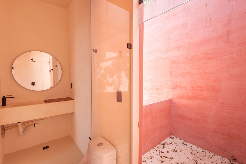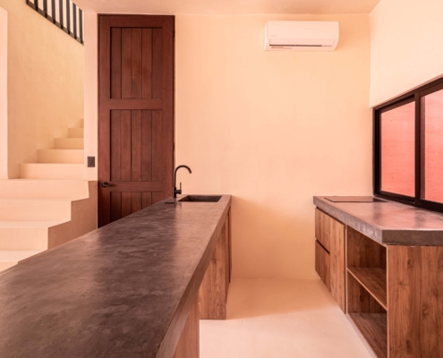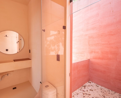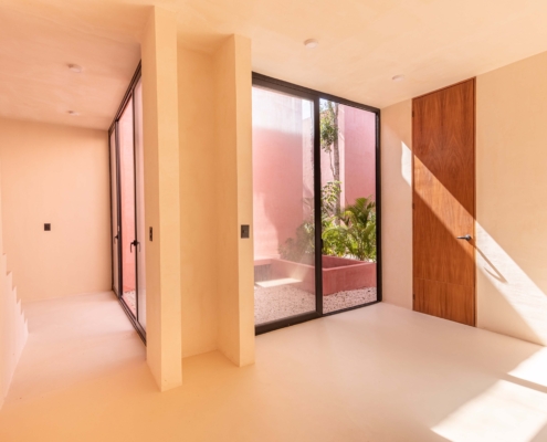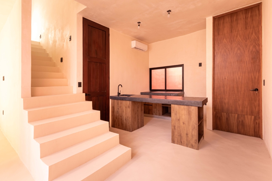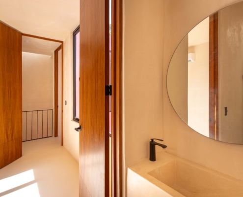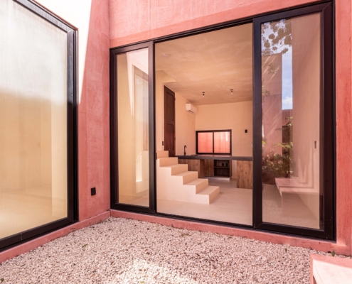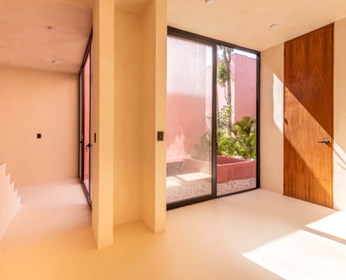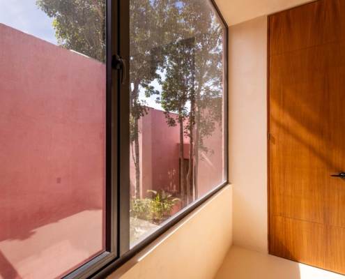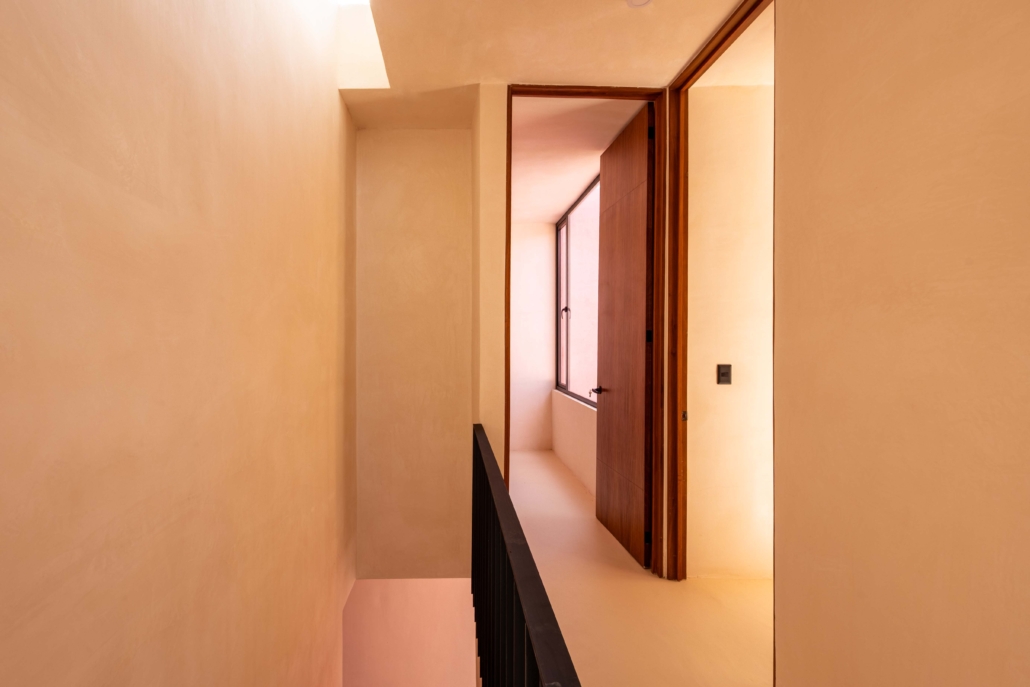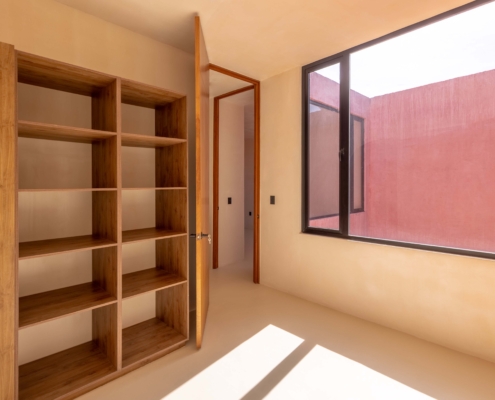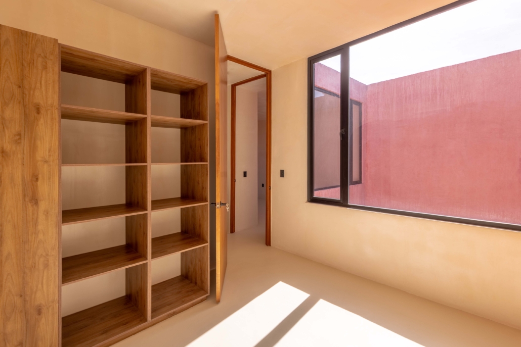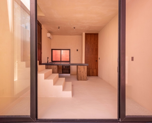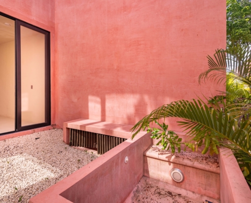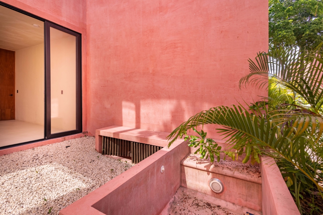 The playful configuration of intertwined volumes in reddish tones poses a pattern of hollows and solids between shadows in the Mexican city of Tulum, in the Yucatan Peninsula. Separated by an elongated garden of native plants, the arrangement of 39 dwellings in two parallel rows allows for cross ventilation and natural lighting of the spaces. Between sheets of water, the sculptural composition is defined by a coating of local tradition, the chukum, a mixture of the resin of the tree of the same name with cement and limestone, which gives the project an identity of its own. The complex has a permeable and vegetated floor in the common areas and parking lots, facilitating sustainable water management and environmental balance.