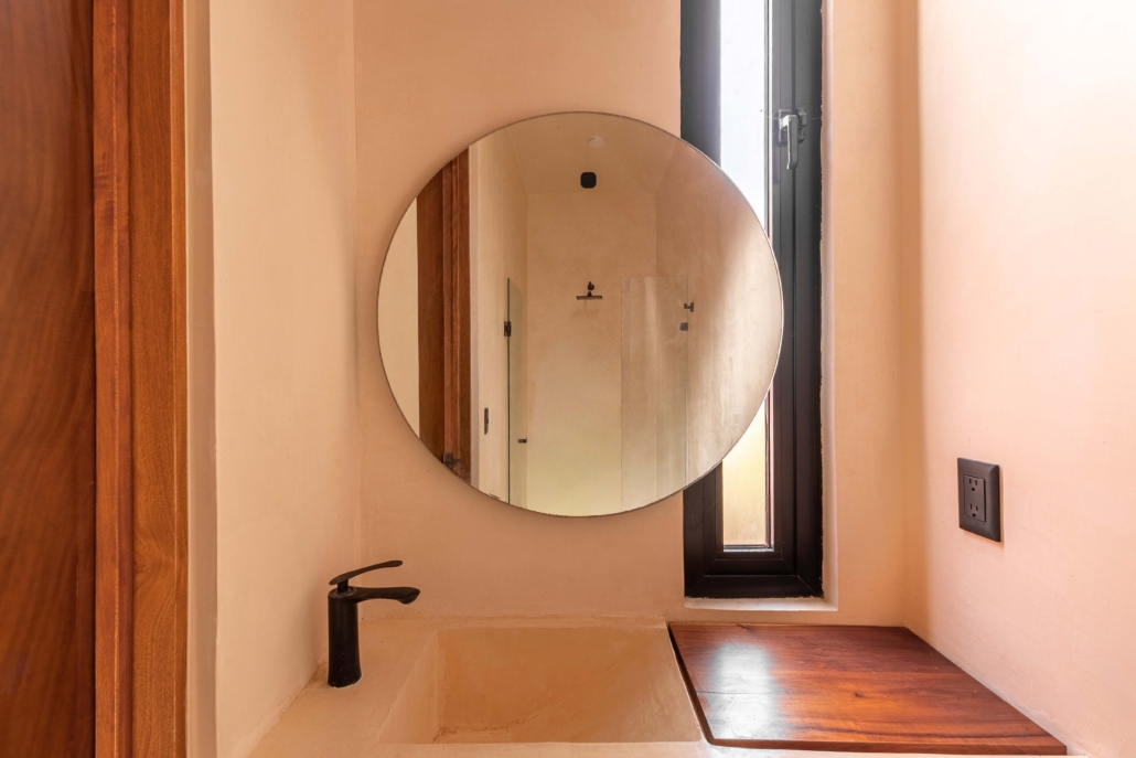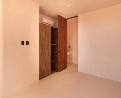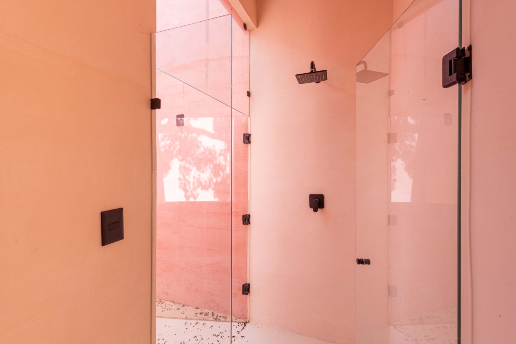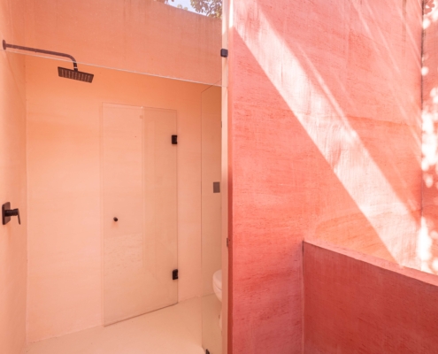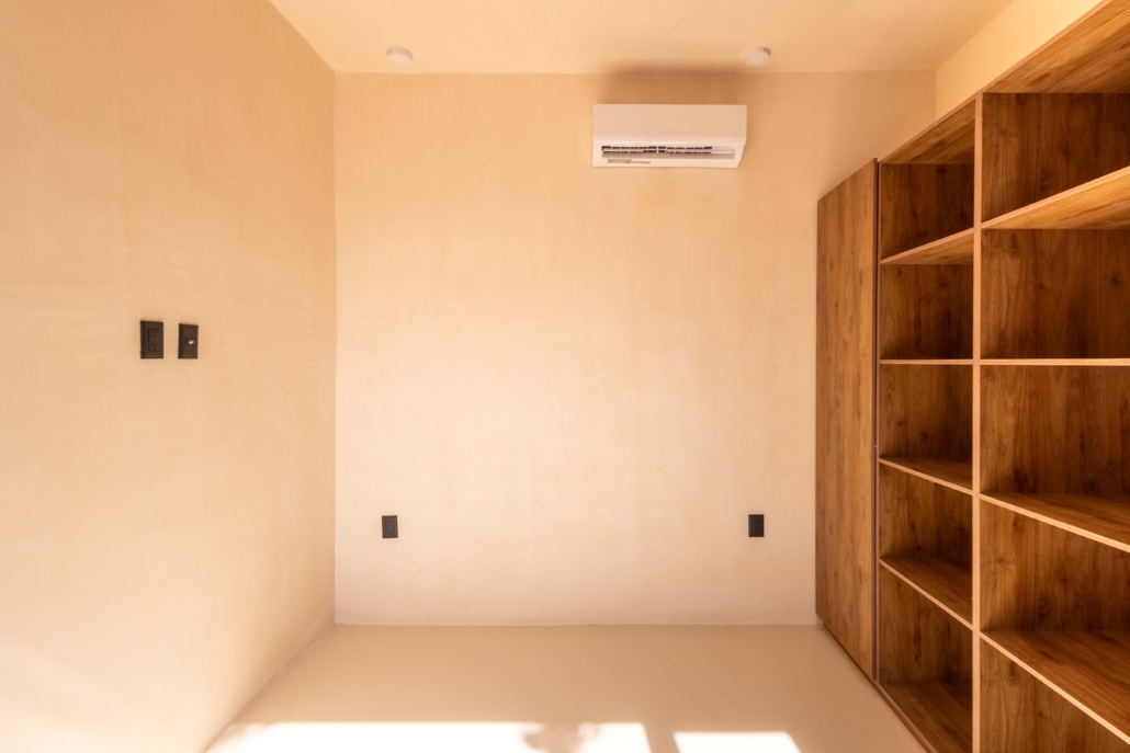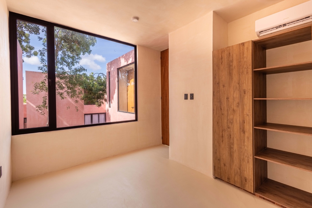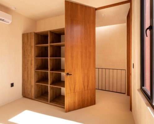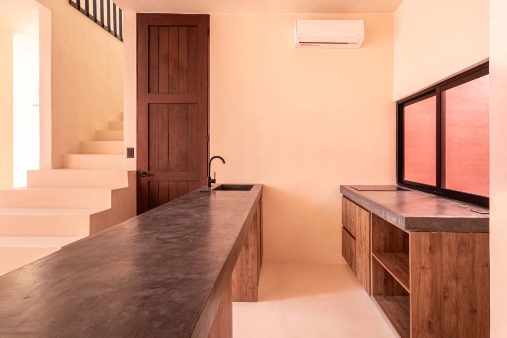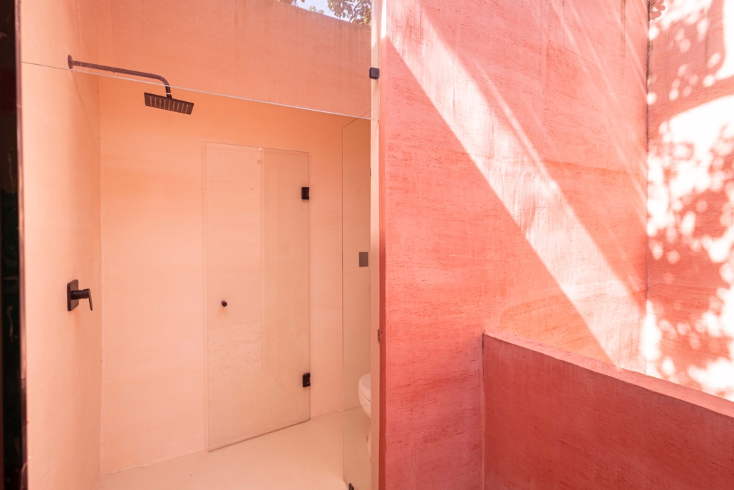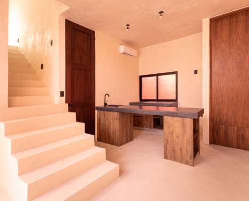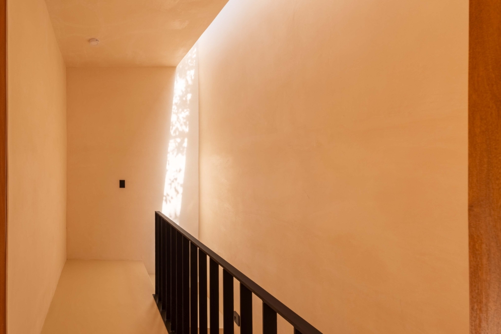 The playful configuration of intertwined volumes in reddish tones poses a pattern of hollows and solids between shadows in the Mexican city of Tulum, in the Yucatan Peninsula. Separated by an elongated garden of native plants, the arrangement of 39 dwellings in two parallel rows allows for cross ventilation and natural lighting of the spaces. Between sheets of water, the sculptural composition is defined by a coating of local tradition, the chukum, a mixture of the resin of the tree of the same name with cement and limestone, which gives the project an identity of its own. The complex has a permeable and vegetated floor in the common areas and parking lots, facilitating sustainable water management and environmental balance.