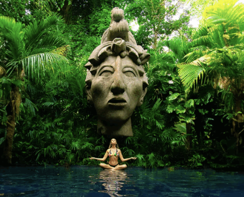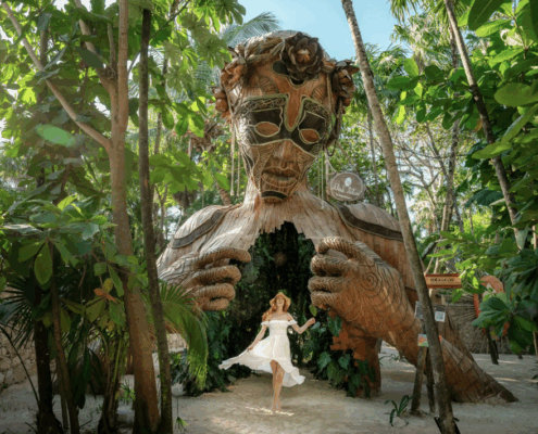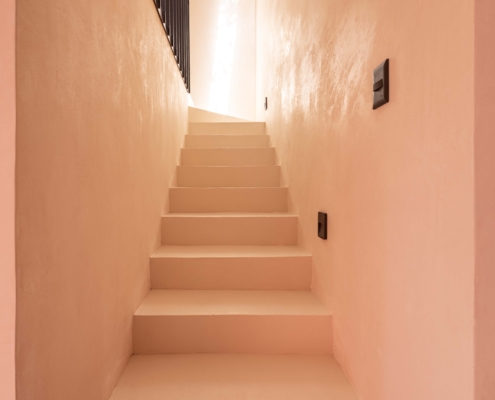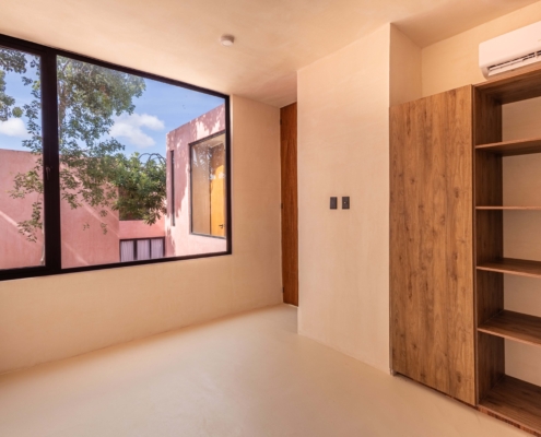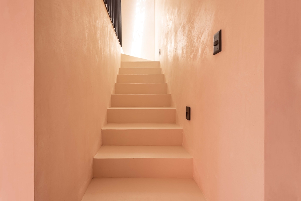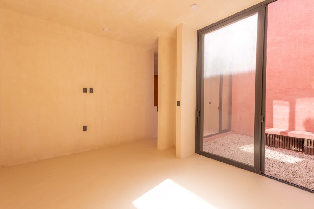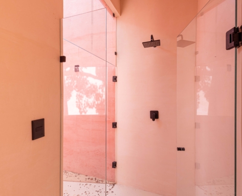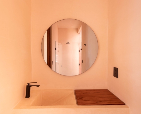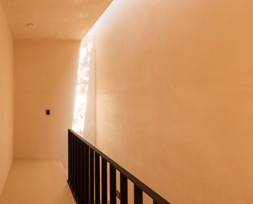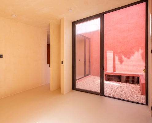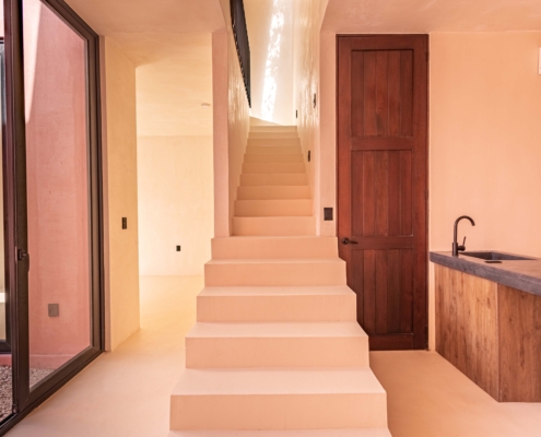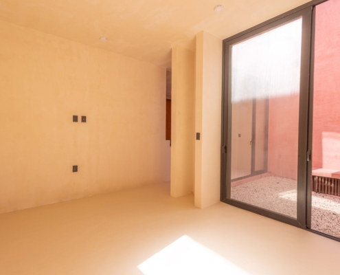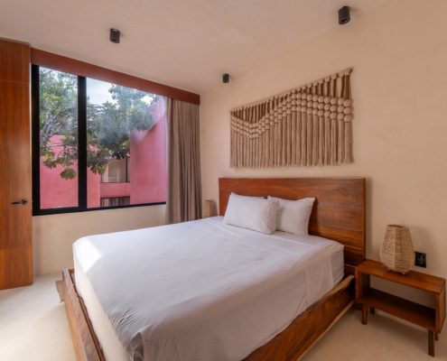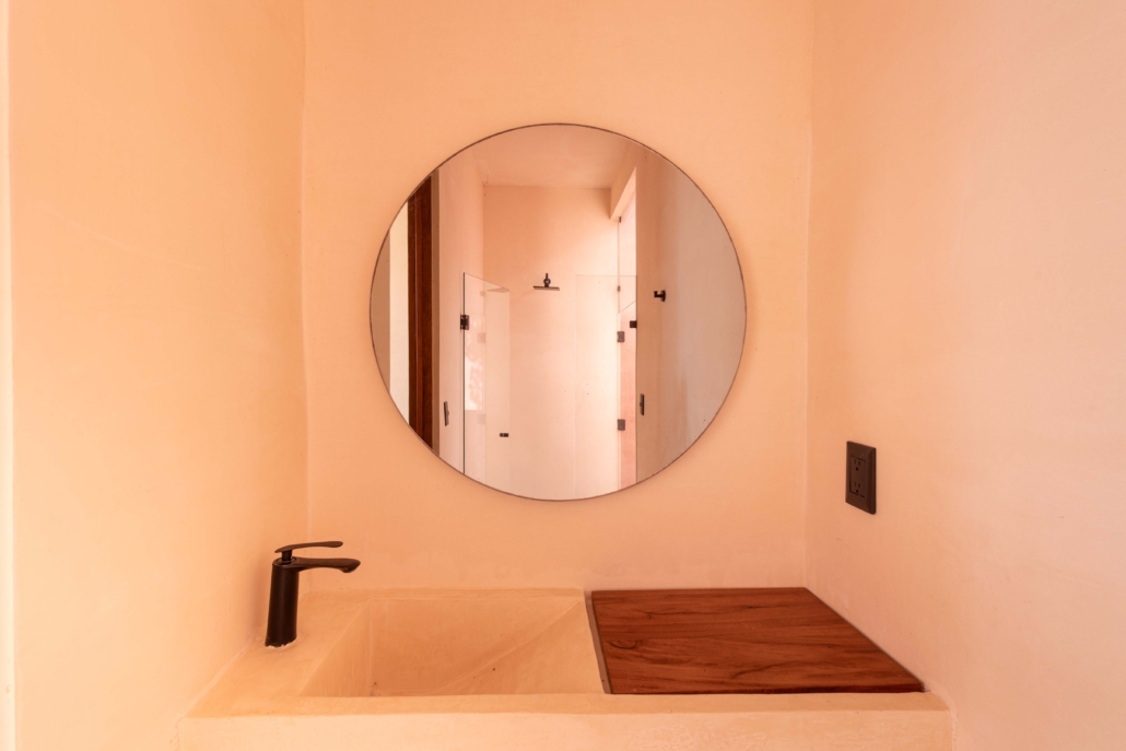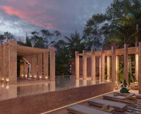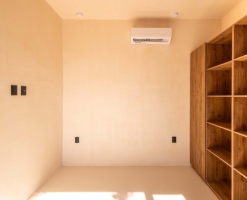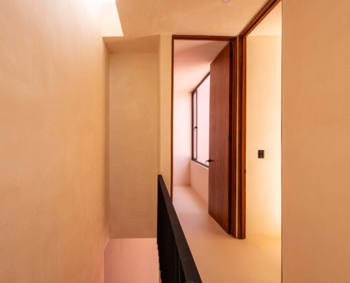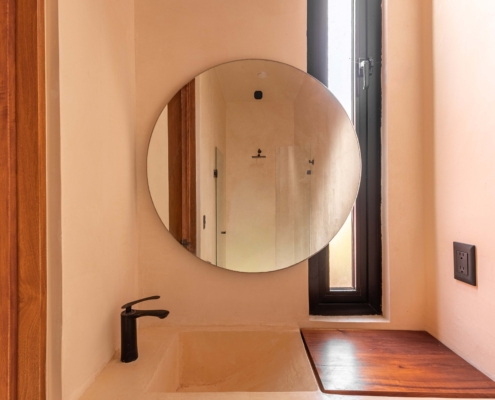The playful configuration of intertwined volumes in reddish tones poses a pattern of hollows and solids between shadows in the Mexican city of Tulum, in the Yucatan Peninsula. Separated by an elongated garden of native plants, the arrangement of 39 dwellings in two parallel rows allows for cross ventilation and natural lighting of the spaces. Between sheets of water, the sculptural composition is defined by a coating of local tradition, the chukum, a mixture of the resin of the tree of the same name with cement and limestone, which gives the project an identity of its own. The complex has a permeable and vegetated floor in the common areas and parking lots, facilitating sustainable water management and environmental balance.